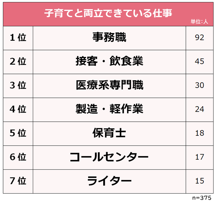 回答数の多い順に、「子育てと両立できている仕事」のランキングを紹介します。